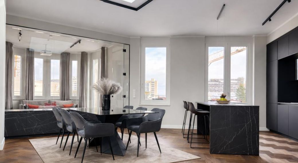 Maximaler Wohnkomfort und durchdachtes Design – in dieser Penthouse-Wohnung wurde jedes Detail mit kreativem Know-how und höchster Sorgfalt gestaltet. Ein besonderes Highlight ist der verglaste Erker, der als gemütlicher Rückzugsort für entspannte Abende auf dem Sofa dient. Zwei großzügige Schlafzimmer, jeweils mit eigenem luxuriösen Bad, schaffen wahre Wohlfühloasen für Ruhe und Erholung.